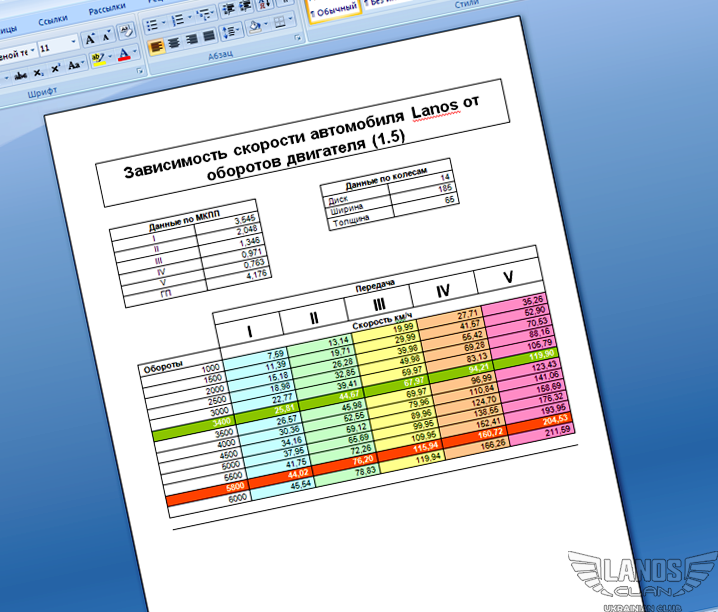 Зависимость скорости автомобиля Lanos от оборотов двигателя (1.5)