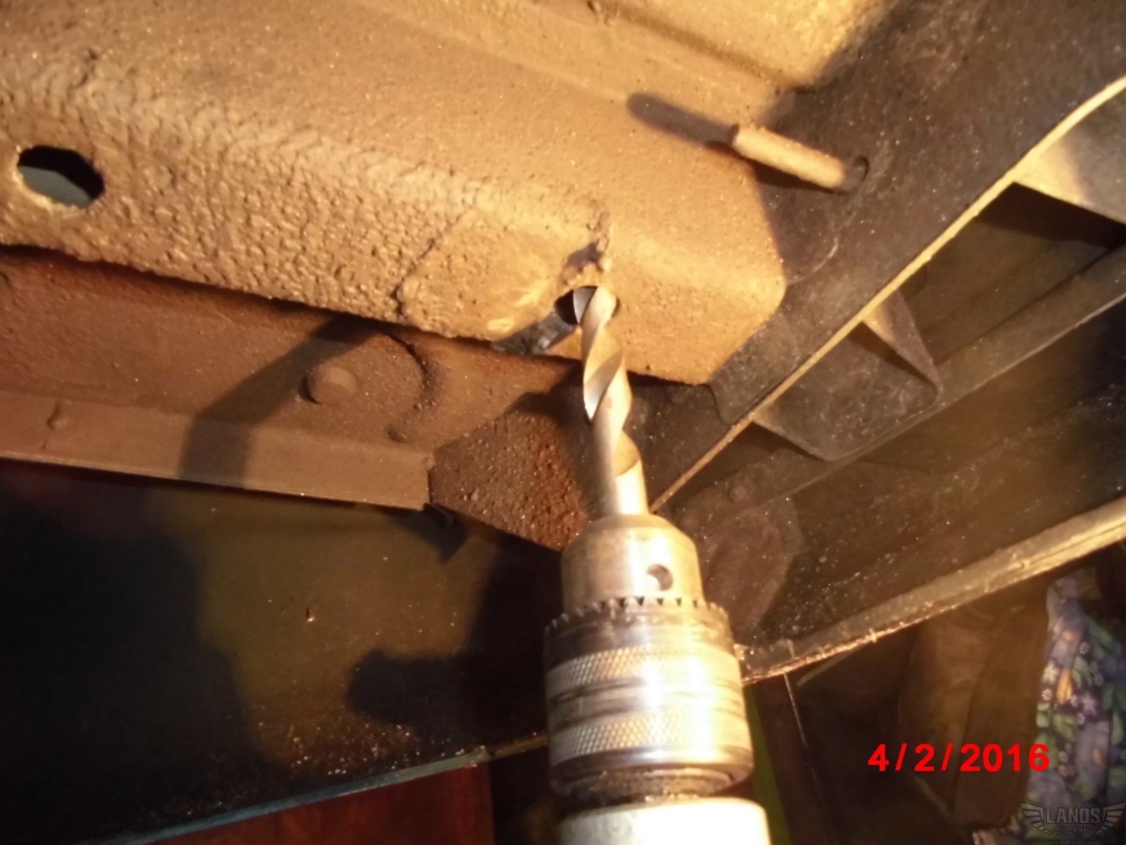 Через отверстия в лонжероне с низу авто, сверлом 6мм ровно по центру отверстия, просверливаем пол багажника. Почему я взял сверло 6мм я поясню чуть далее.