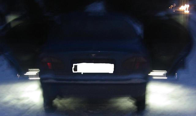я покупал на базаре готовую ленту на 9 светодиодов (она в пленке не боится влаги), она сразу идет с 30 см проводом, так что ничего не резал!!! Сразу говорю ничего не затирает и не цепляет! И еще один главный момет- надо очень хорошый двухсторонний скотч (15-30 гривен), я брал за 15, на перед и назад кидал одинаковые